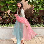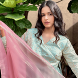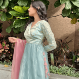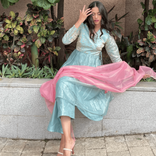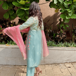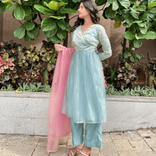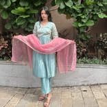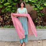 Powder blue kurta set with Pink Organza Dupatta and Side tie up detail