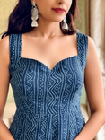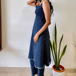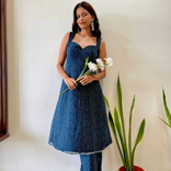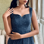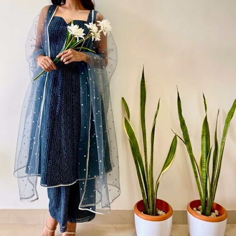 Crafted in premium georgette, this deep blue kurta set features intricate tonal embroidery and a structured sweetheart neckline for an elegant silhouette. Designed with a concealed side zip for a seamless fit, it is paired with straight-fit pants and a sheer dotted organza dupatta that adds soft, dreamy movement. Lightweight, graceful and perfect for evening gatherings, festive dinners and intimate celebrations.