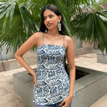 Lightweight indigo floral kurti top with delicate straps and a flattering fitted silhouette.