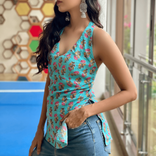 A refreshing turquoise floral halter kurti crafted in breathable cotton fabric. Designed with a structured fitted bodice, slightly flared hem and side slit detailing, it offers a flattering silhouette with all-day comfort. Lightweight and easy to style, has a back zipper for fitting, perfect for brunches, casual outings and summer festive looks.
